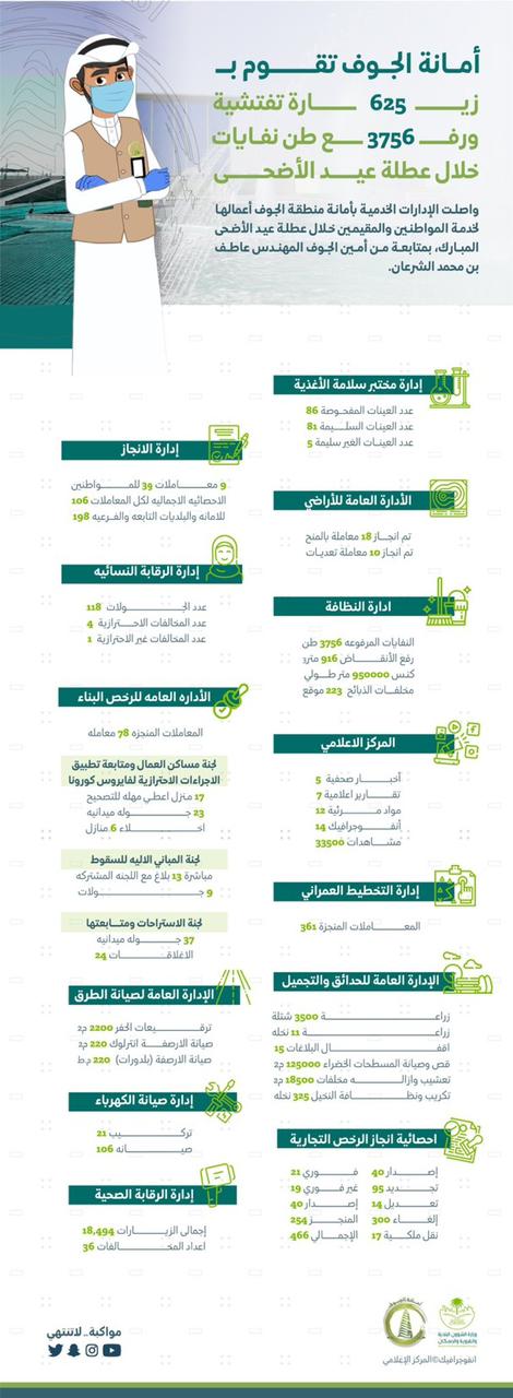 واصلت الإدارات الخدمية في أمانة منطقة الجوف والبلديات التابعة لها أعمالها لخدمة المواطنين والمقيمين خلال عطلة عيد الأضحى المبارك بمتابعة من أمين المنطقة المهندس عاطف بن محمد الشرعان.