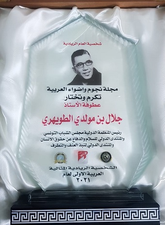 تم اختيار الأستاذ جلال الطويهري رئيس المنظمة الدولية لمجلس الشباب التونسي والمنتدى الدولي للسلام والدفاع عن حقوق الإنسان والمنتدى الدولي لنبذ العنف وفض النزاعات بالطرق السلمية ” الشخصية الريادية المثالية الأولى لعام 2021 وذلك لجهوده الجبارة في نشر السلام والدفاع عن حقوق الإنسان , وهو شخصية اعتبارية محبوبة وقريبة من الناس وله مكانة مرموقة عند الجميع .