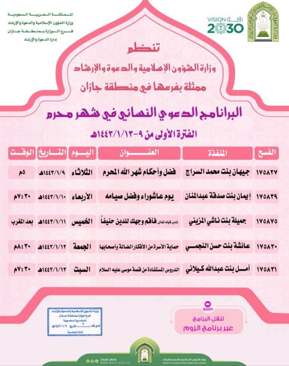 ينطلق اليوم الثلاثاء التاسع من شهر محرم 1443هـ، البرنامج الدعوي النسائي، الذي تنظمه وزارة الشؤون الإسلامية والدعوة والإرشاد، ممثلة بفرعها في منطقة جازان، ويستمر حتى الثالث عشر منه، بمشاركة عدد من الداعيات “عن بعد” عبر منصة “زووم”.