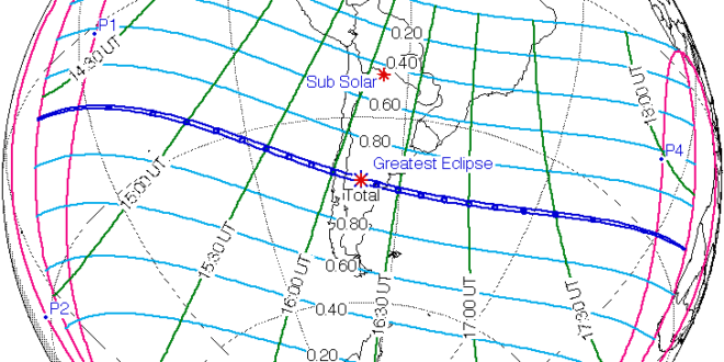 وسوف يكون الكسوف كليا فى تشيلى ، ويغطى الكسوف الكلى مساحة عرضها 90 كم وسوف يستغرق مدة قدرها دقيقتين و10 ثوان، وعند ذروة الكسوف الكلى يغطى قرص القمر قرص الشمس بالكامل ، وسوف يستغرق منذ بدايته وحتى نهايته مدة قدرها 5 ساعات و 20 دقيقة ولا يمكن رؤيته فى مصر والمنطقة العربية.