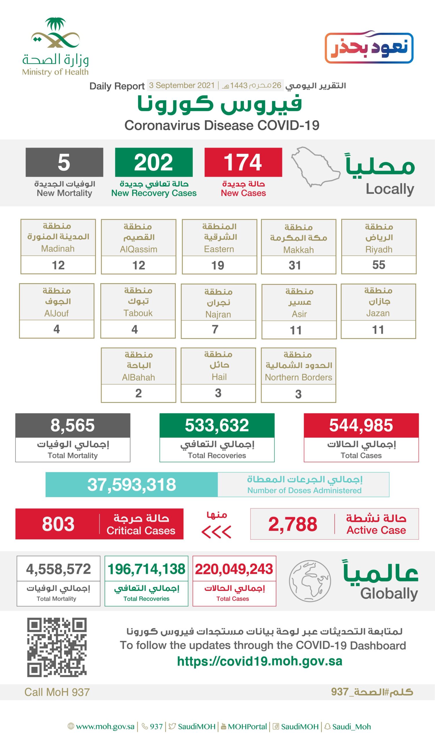 وفي السياق نفسه أعلنت الصحة إحصائية جديدة لمستجدات كورونا في المملكة خلال الـ 24 ساعة الماضية تضمنت تسجيل (174) حالة مؤكدة وتعافي(202) حالة، فيما بلغ عدد الحالات النشطة (2788) حالة منها (803) حالات حرجة.
