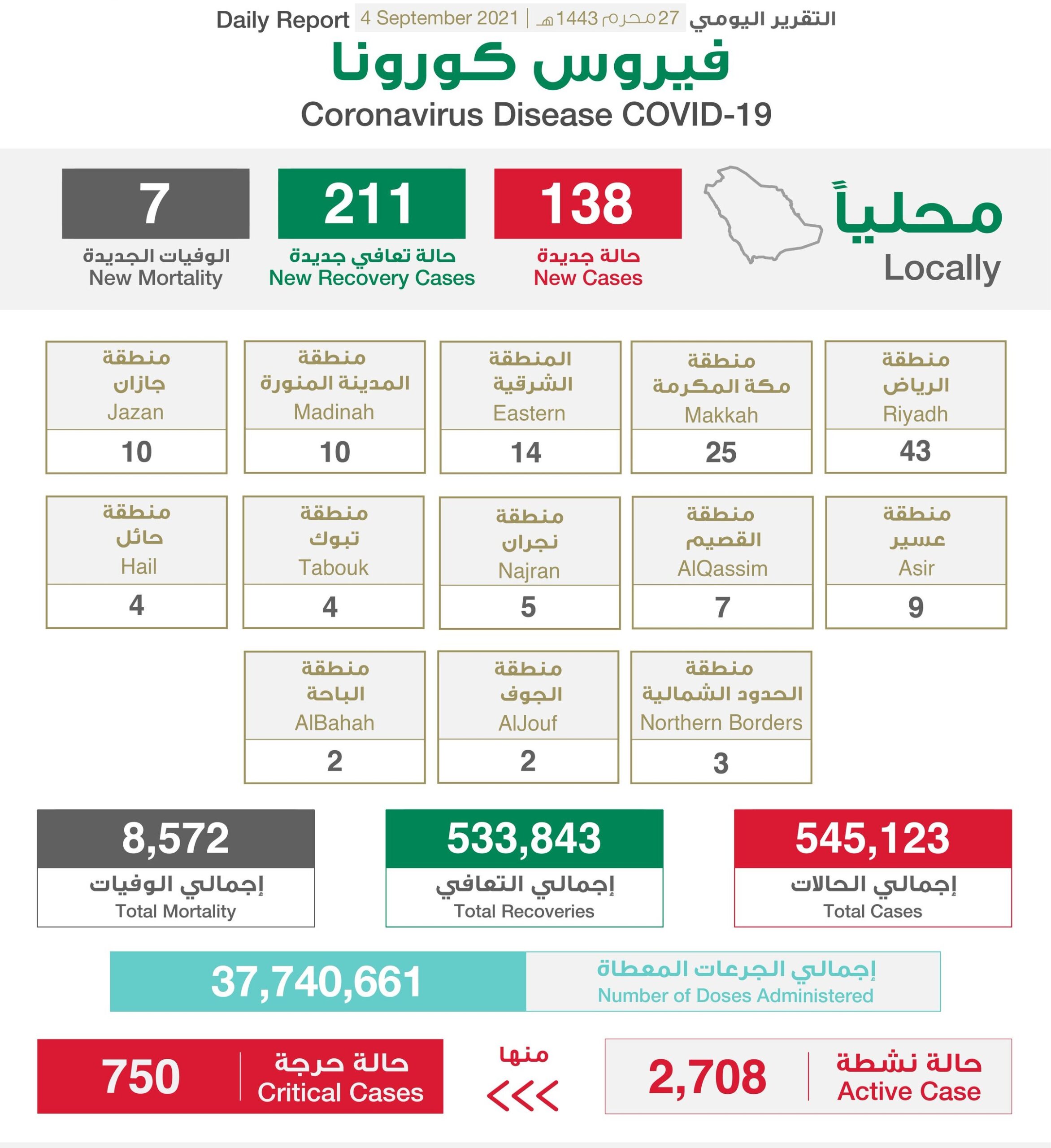 وفي نفس السياق أعلنت الصحة إحصائية جديدة لمستجدات كورونا في المملكة خلال ال24 ساعة الماضية تضمنت تسجيل (138) حالة مؤكدة وتعافي(211) حالة فيما بلغ عدد الحالات النشطة (2708) حالات منها (750) حالة حرجة.