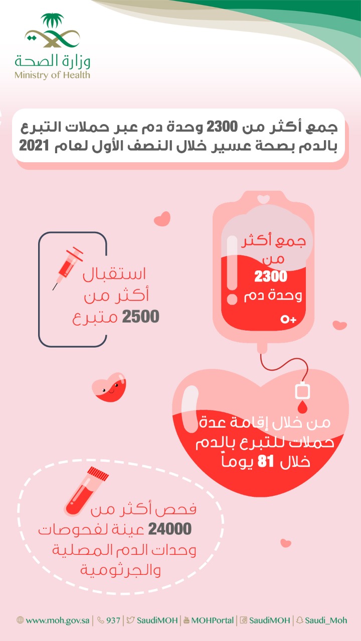 جمع أكثر من 2300 وحدة دم عبر حملات التبرع بصحة عسير خلال النصف الأول لعام 2021.