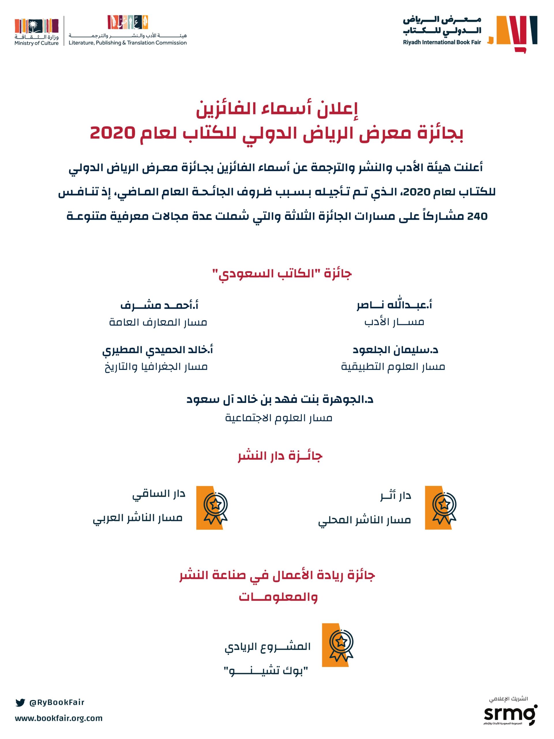 أعلنت هيئة الأدب والنشر والترجمة عن أسماء الفائزين بجائزة معرض الرياض الدولي للكتاب لعام 2020، بمساراتها الثلاثة: جائزة الكاتب السعودي، وجائزة دور النشر، وجائزة ريادة الأعمال في صناعة النشر والمعلومات، التي تنافس عليها 240 مشاركاً، من بينهم 170 كاتباً لمسار جائزة الكاتب السعودي، التي شملت عدة مجالات معرفية متنوعة، منها: الفلسفة والمؤلف السعودي والمعارف العامة والديانات والعلوم البحتة والعلوم الاجتماعية واللغات والعلوم التطبيقية والجغرافيا والتاريخ والفنون والآداب.