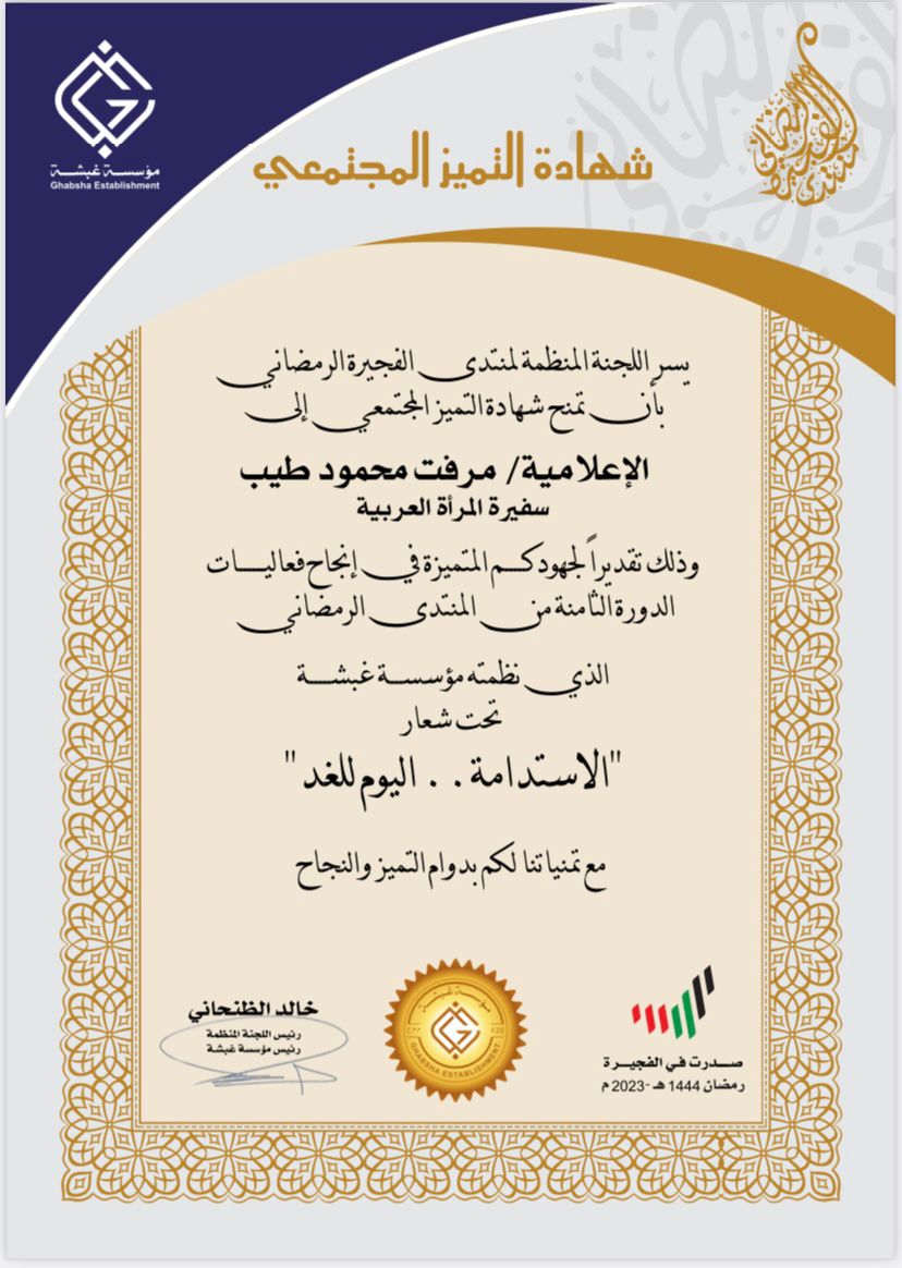 منحت اللجنة المنظمة لمنتدى الفجيرة الرمضاني برئاسة سعادة الدكتور خالد الظنحاني رئيس مؤسسة غبشة الإماراتية، الإعلامية مرفت محمود طيب (سفيرة المرأة العربية) ، شهادة التميز المجتمعي ، وذلك تقديرًا لجهودها المتميزة في إنجاح فعاليات الدورة الثامنة من المنتدى الرمضاني الذي نظمته مؤسسة غبشة تحت شعار ”الاستدامة .. اليوم للغد“.