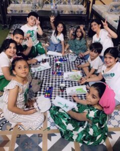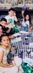 كما قالت الطفلة لين وأخوها يزن إنها تحتفل باليوم الوطني مع جميع أسرتها ، وأفادت أم عمر أنها توفر كل أدوات الرسم والتلويين وتتابع كل مواهب المدينة وتشجع تلك الأيادي الوطنية الصغيرة والكبيرة بعملها وفنها وتكرم كل من شارك وعبر عن فرحة الوطن تحت عنوان “هي دار لنا” ..