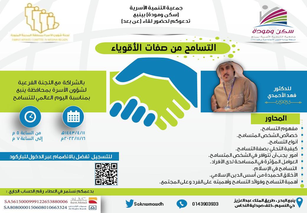 تنظم جمعية التنمية الأسرية(سكن ومودة) بينبع بالشراكة مع اللجنة الفرعية لشؤون الأسرة بمحافظة ينبع لقاء توعوي بمناسبة اليوم العالمي للتسامح (عن بعد ) عبر منصة زووم بعنوان (التسامح من صفات الأقوياء ).