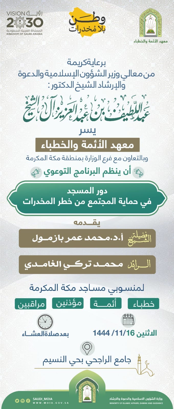 برعاية معالي وزير الشؤون الإسلامية والدعوة والإرشاد الشيخ الدكتور عبداللطيف بن عبدالعزيز آل الشيخ تنظم الوزارة ممثلة بمعهد الأئمة والخطباء اليوم الاثنين السادس عشر من شهر ذي القعدة الجاري البرنامج التوعوي الموجه لمنسوبي مساجد منطقة مكة المكرمة من خطباء وائمة ومؤذنين ومراقبين بعنوان: (دور المسجد في حماية المجتمع من خطر المخدرات) يقدمه الأستاذ الدكتور محمد عمر بازمول والرائد محمد تركي الغامدي في جامع الراجحي بحي النسيم بعد صلاة العشاء.