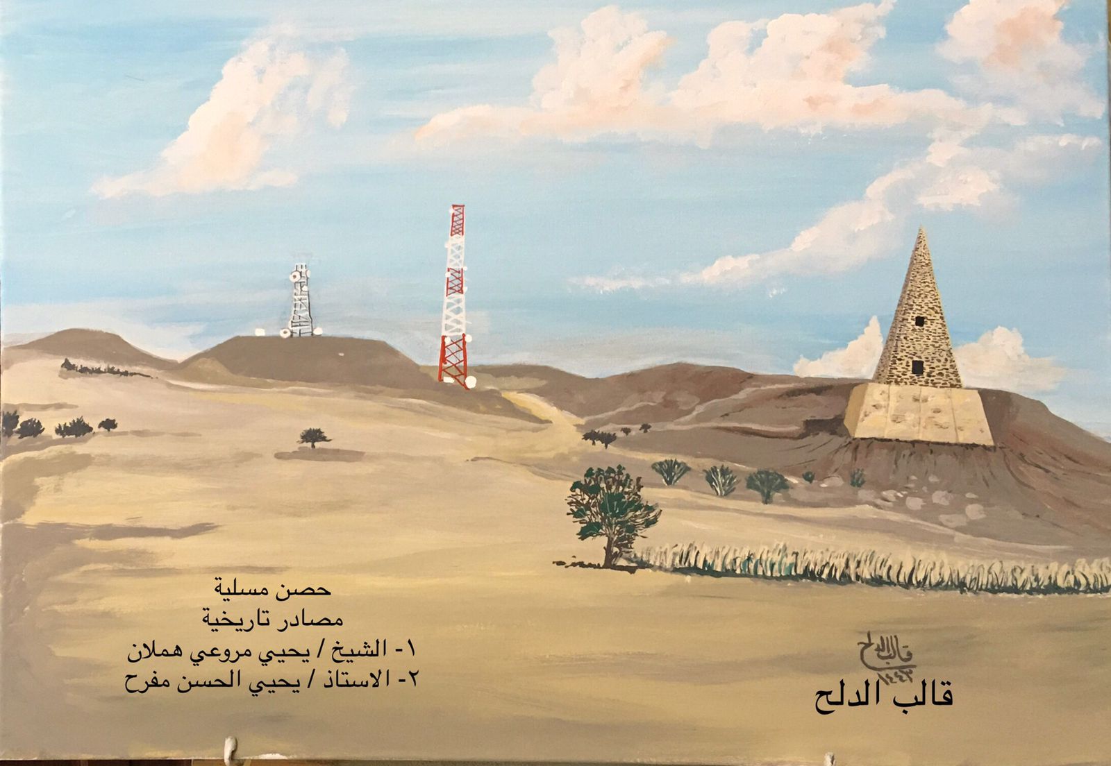 حصن مسلية من المواقع الاثرية والتاريخية في محافظة بيش ويقع على جبل مسلية المطل على وادي بيش من الشرق والجنوب ، وقد اندثر بفعل العوامل البيئية ، وقد حرصت على إحياء هذا الحصن بالفرشاة نظرا لأني كنت استمتع برؤيته عن بعد من مزارع الحصن التي تقع جنوب الحصن ، ولكن تفاصيل الحصن وبنيته لم أكن اعرفها.