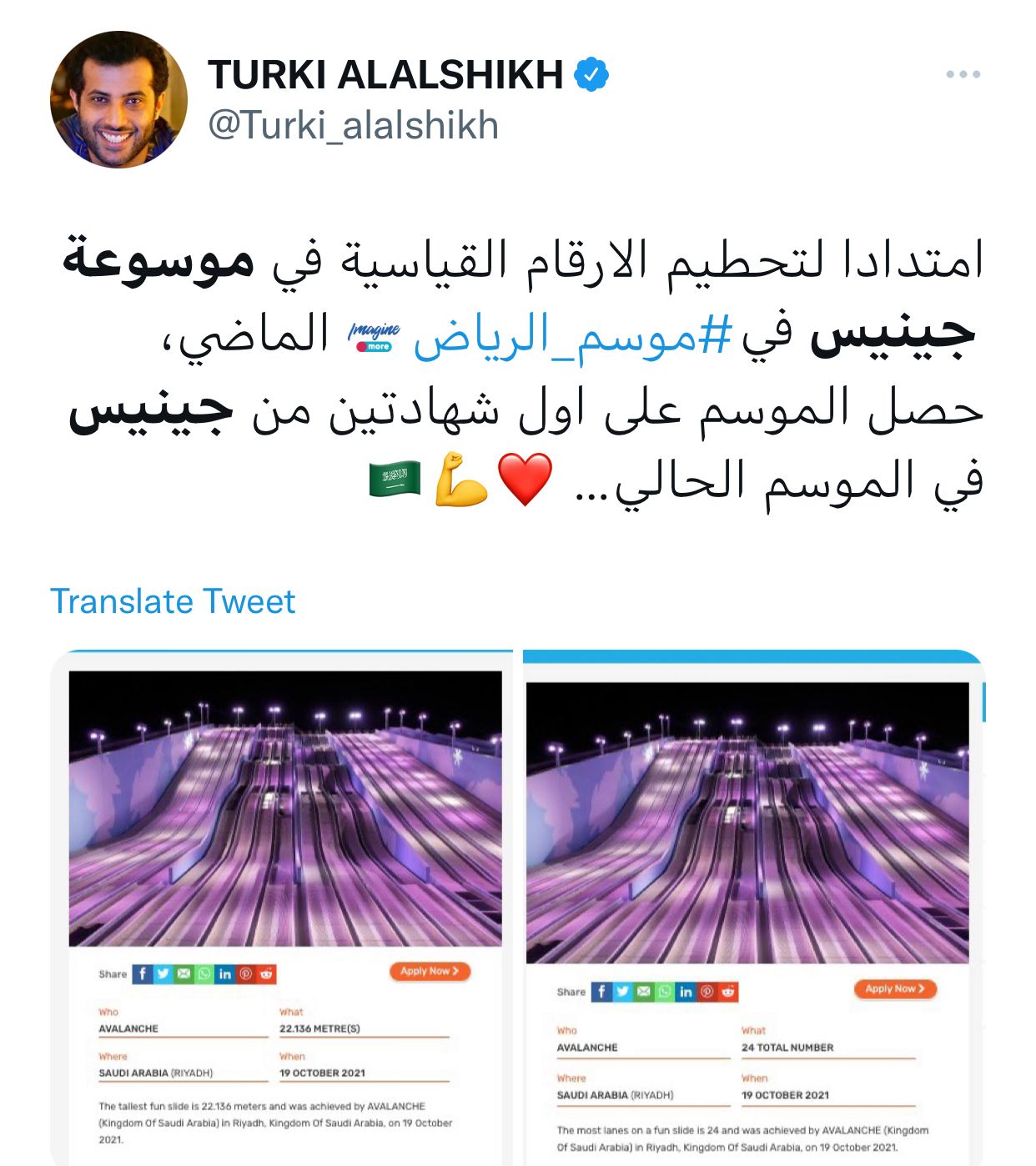 أعلن معالي المستشار تركي آل الشيخ، رئيس مجلس إدارة الهيئة العامة للترفيه مساء أمس الخميس، عن دخول #موسم_الرياض2021 موسوعة غينيس العالمية للأرقام القياسية وحصل موسم الرياض2021 على شهادتين عالميتين، وحطم الأرقام القياسية كأكبر حدث ترفيهي شامل، وقال معالي المستشار تركي آل الشيخ في تغريدة عبر حسابه الشخصي في “تويتر” : “امتدادًا لتحطيم الأرقام القياسية في موسوعة غينيس في موسم الرياض الماضي، حصل الموسم على أول شهادتين من غينيس في الموسم الحالي”. و بدأت فعاليات موسم الرياض في الفترة من 20 أكتوبر/ إلى الأول من نوفمبر/ 2021.