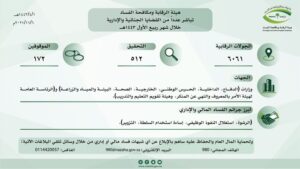 باشرت هيئة الرقابة ومكافحة الفساد خلال شهر ربيع الأول 1443هـ، اختصاصاتها ومهامها من خلال عمل (6061) جولة رقابية، وكذلك التحقيق مع (512) متهماً في قضايا إدارية وجنائية، وإيقاف (172) مواطناً ومقيماً منهم موظفين من وزارات (الدفاع، الداخلية، الحرس الوطني، الخارجية، الصحة، البيئة والمياه والزراعة) و(الرئاسة العامة لهيئة الأمر بالمعروف والنهي عن المنكر، وهيئة تقويم التعليم والتدريب) لتورطهم بتهم (الرشوة، استغلال النفوذ الوظيفي، إساءة استخدام السلطة، التزوير) وجارٍ استكمال الإجراءات النظامية تمهيداً لإحالتهم للقضاء.