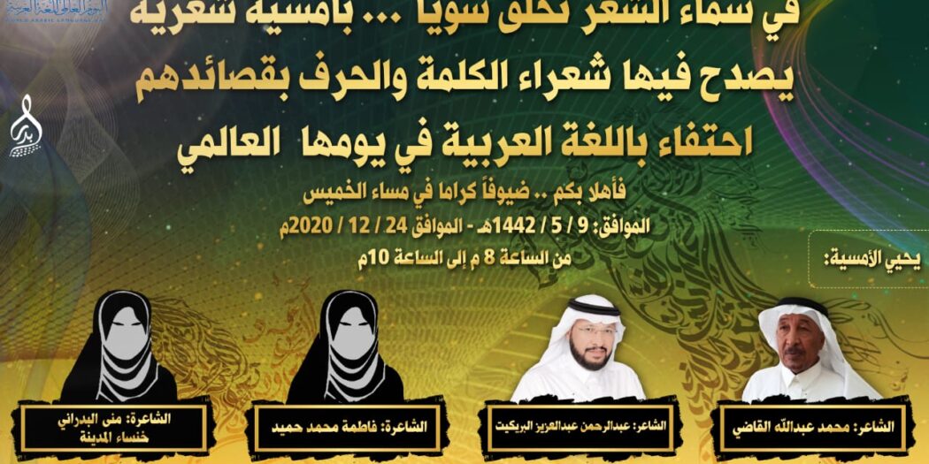 نظمت إدارة تعليم العلا لشؤون التعليمية متمثلة بالنشاط الطلابي (بنين / بنات) أمسية شعرية (عن بعد) بمناسبة اليوم العالمي للغة العربية وذلك من خلال البث المباشر عبر تطبيق الزووم.