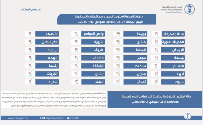 توقع المركز الوطني للأرصاد في تقريره عن حالة الطقس لهذا اليوم – بمشيئة الله تعالى – سماء صحو إلى غائمة جزئيًا مع فرصة لتكوّن السحب الرعدية الممطرة المصحوبة برياح نشطة على أجزاء من مرتفعات جازان، عسير، الباحة ومكة المكرمة، كما تتهيأ الفرصة لهطول أمطار رعدية متوسطة إلى غزيرة مصحوبة برياح نشطة خلال فترة المساء والليل على الأجزاء الساحلية من منطقتي المدينة المنورة وتبوك، كما يستمر تأثير الرياح النشطة المثيرة للأتربة والغبار على أجزاء من وسط وشرق المملكة، في حين لا يستبعد تكوّن الضباب خلال ساعات الصباح الباكر على أجزاء من سواحل البحر الأحمر والخليج العربي.