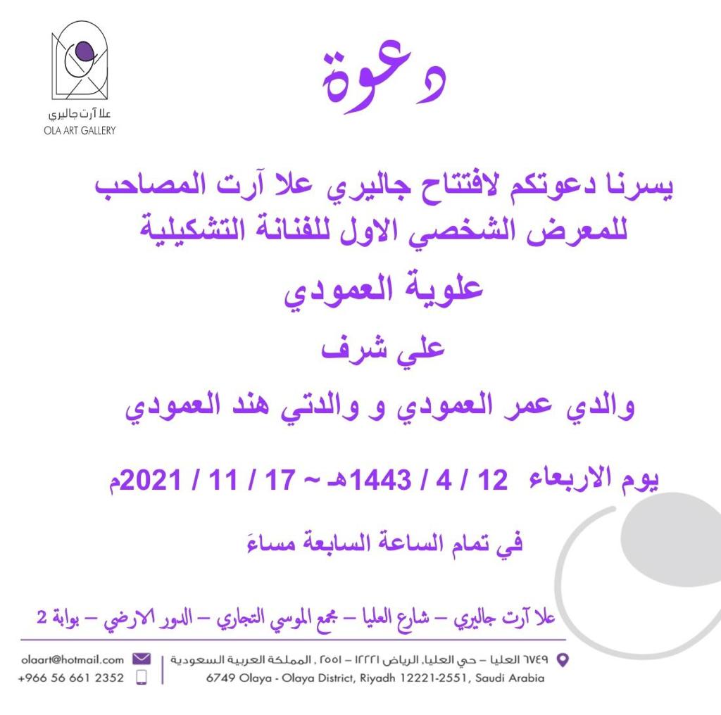 تطلق الفنانة التشكيلية علوية العمودي معرضها الشخصي الأول بجاليري علا آرت يوم الأربعاء ١٢ ربيع الثاني لعام ١٤٤٣هـ على شرف والدها عمر العمودي ووالدتها هند العمودي