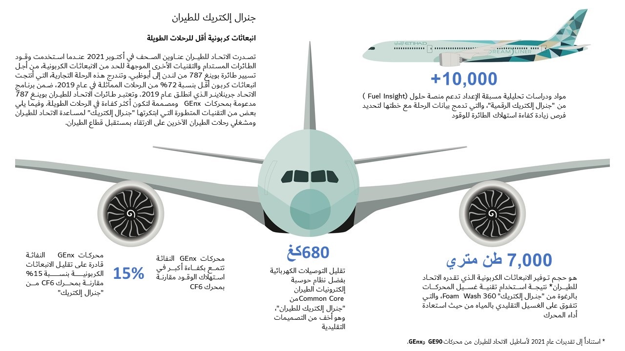 وتختبر الاتحاد للطيران حلول (Fuel Insight ) من “جنرال إلكتريك الرقمية”، والتي تساهم بتوفير التكلفة والحد من الانبعاثات وتعمل على تحليل البيانات الصادرة مباشرة عن الطائرة وشركة الطيران لدمج بيانات الرحلة مع خطتها. وتساعد هذه البيانات الهامة في زيادة كفاءة استهلاك الطائرة للوقود والحد من الانبعاثات. كما تمنح هذه الحلول مشغلي الطائرات مخرجات بحثية قابلة للتطبيق على مستويات عديدة وتدعم التحليلات للانتقال من النظرة العامة إلى التفاصيل الكلية الدقيقة لفهم مشكلة كل رحلة على حدة.