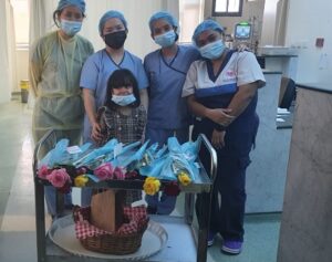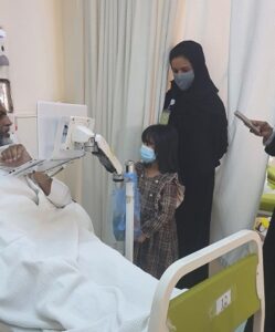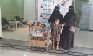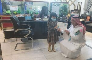 هذا وقد احتضن مركز الدكتور بسام الحمصي الطبي سفيرة صعوبات التعلم لتين السدراني بكل حب وقد لفتت الأنظار إليها وهي تقود عربة الورد والهدايا لوحدها ، ويرافقها والدتها والمتطوعة الأستاذة مريم الحفظي في زيارة المرضى بالمركز. وقد كان في استقبالهم الأخصائية الاجتماعية أمل الشيباني والأستاذ محمد مصطفى حيث تجولوا في المركز وزاروا استشاري أمراض الكلى بالمركز الدكتور محمد صبري وجميع مرضى الكلى، وكانت السفيرة لتين تتحدث معهم وابتسامتها لا تفارق وجهها الصغير ، فزرعت الأمل في نفوسهم وسروا كثيرا بزيارتها ، ودعت لهم بالشفاء العاجل ، وكانت تختم كلامها معهم بقولها ” جيتكم اليوم أسلم عليكم وأهديكم وردة وأدعوا لكم بالشفاء لأني أحبكم ” .