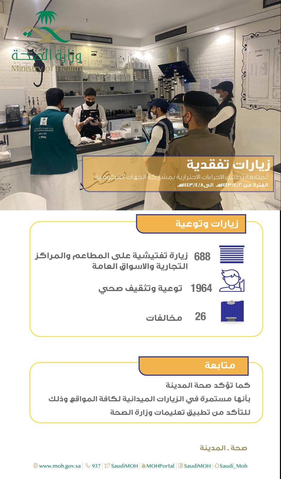 نفّذت صحة المدينة المنورة 688 جولة رقابية، وذلك خلال الفترة من 1443/4/3 -1443/4/8 بهدف التأكد من الالتزام وتطبيق الإجراءات الاحترازية؛ للحد من انتشار فيروس (كورونا). وشملت الجولات المراكز التجارية، والأسواق العامة، والمطاعم, كما قُدِّم من خلالها التوعية الصحية ل 1964 شخص.