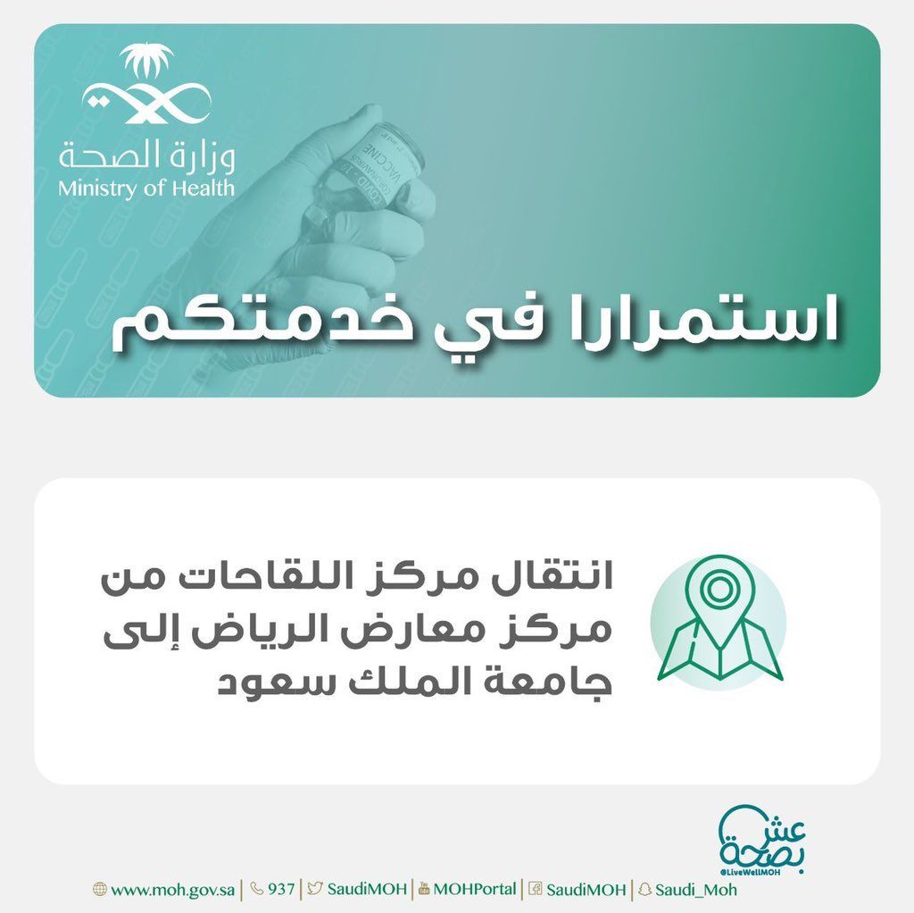 أعلنت صحة الرياض اليوم عن ‏انتقال مركز اللقاحات من مركز معارض الرياض إلى مقر جامعة الملك سعود، بداية من يوم غد الاثنين.