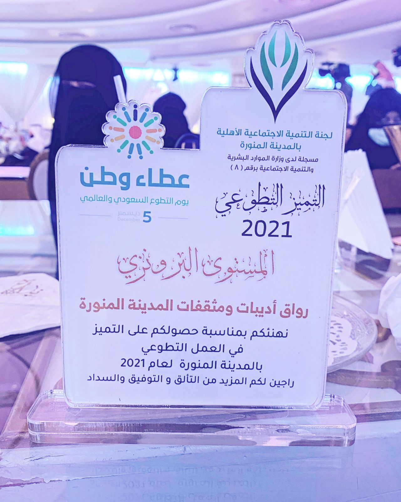 ضمن حفل “اليوم السعودي والعالمي للتطوع ” والذي نظمته “لجنة التنمية الاجتماعية الاهلية بالمدينة المنورة “يوم أمس السبت ٧ ربيع الثاني ١٤٤٣ الموافق ١١ ديسمبر ٢٠٢١، في قاعة نيارة وبحضور مدير تنمية المجتمع الأستاذ/ ناصر القاضي ، وذلك تقديرا لجهود الفرق التطوعية المميزة بالمدينة المنورة ؛ كرمت لجنة التنمية الاجتماعية الاهلية بالمدينة المنورة ، “فريق رواق أديبات ومثقفات المدينة المنورة ” وذلك على جهوده المتميزة في خدمة الأدب والثقافة والفن بالمدينة المنورة على مدى عشرة أعوام ، منذ تأسيسه وحتى اليوم .