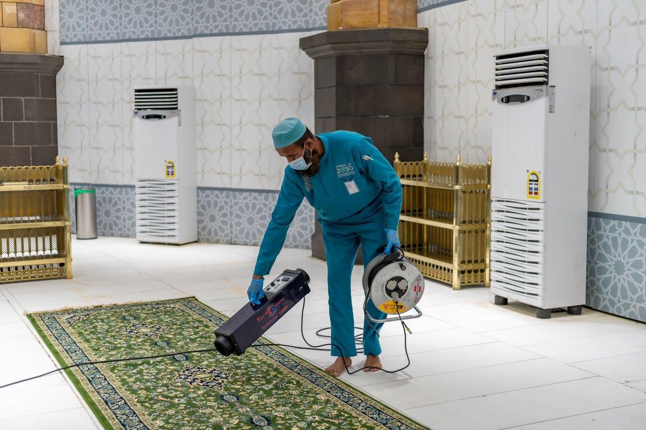 حيث تبدأ الاستعدادات بتجهيز المكبرية، وذلك بتطهيرها وتعقيمها وتعطيرها وفرشها بسجاد جديد وتنظيفه وتعقيمه وتعطيره، وغسل المسجد الحرام وتطهيره، وذلك 10 مرات يومياً يقوم بها أكثر من (٤٠٠٠) عامل وعاملة، وفي كل عملية تطهير تستهلك أكثر من (١٣٠ ألف) لتر من المطهرات، وتعطير المسجد الحرام بأكثر من ٢٥٠٠ لتر وتشغيل ١٠٠ فواحة معطرة داخل توسعة الملك فهد بأدواره، وعلى مدار الساعة باستخدام قرابة (٢٥ ألف لتر) من المعقمات لتعقيم جميع الأسطح.