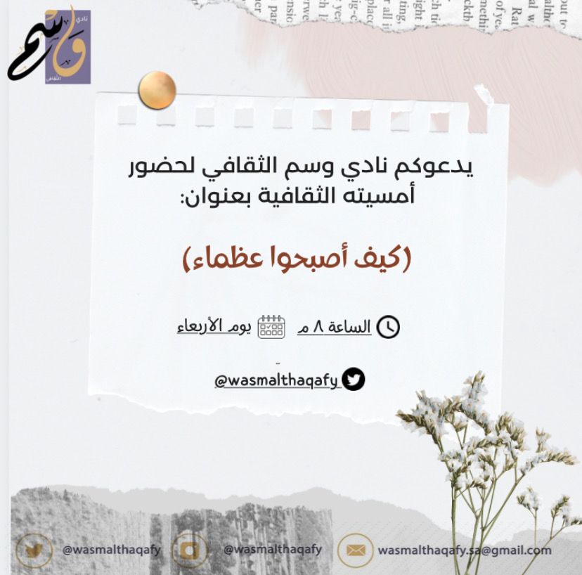 ” سهروا والآخرون نيام .. لذلك أصبحوا عظماء ” .. جمهور و أعضاء ” نادي وسم الثقافي ” ، وعبر صفحات كتاب (كيف أصبحوا عظماء) للمؤلف د .سعد سعود الكريباني ؛ على موعد مع الأمسية الثقافية للنادي . بحضور مبدعي ومبدعات الكلمة والمهتمين بالثقافة والأدب لمناقشة هذا الكتاب ، وذلك يوم الأربعاء القادم ، ١١ ربيع الثاني ١٤٤٣ الموافق ١٥ ديسمبر ٢٠٢١ .