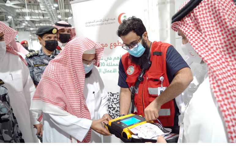 دشنت هيئة الهلال الأحمر السعودي بالشراكة مع شؤون المسجد الحرام والمسجد النبوي مشروع أجهزة الإنعاش القلبي في ساحات الحرم المكي بمكة المكرمة ، بحضور معالي الرئيس العام لشؤون المسجد الحرام والمسجد النبوي الشيخ عبدالرحمن السديس ورئيس الهيئة سعادة الدكتور جلال العويسى وسعادة اللواء محمد البسامي قائد القوات الخاصة لأمن الحج والعمرة.