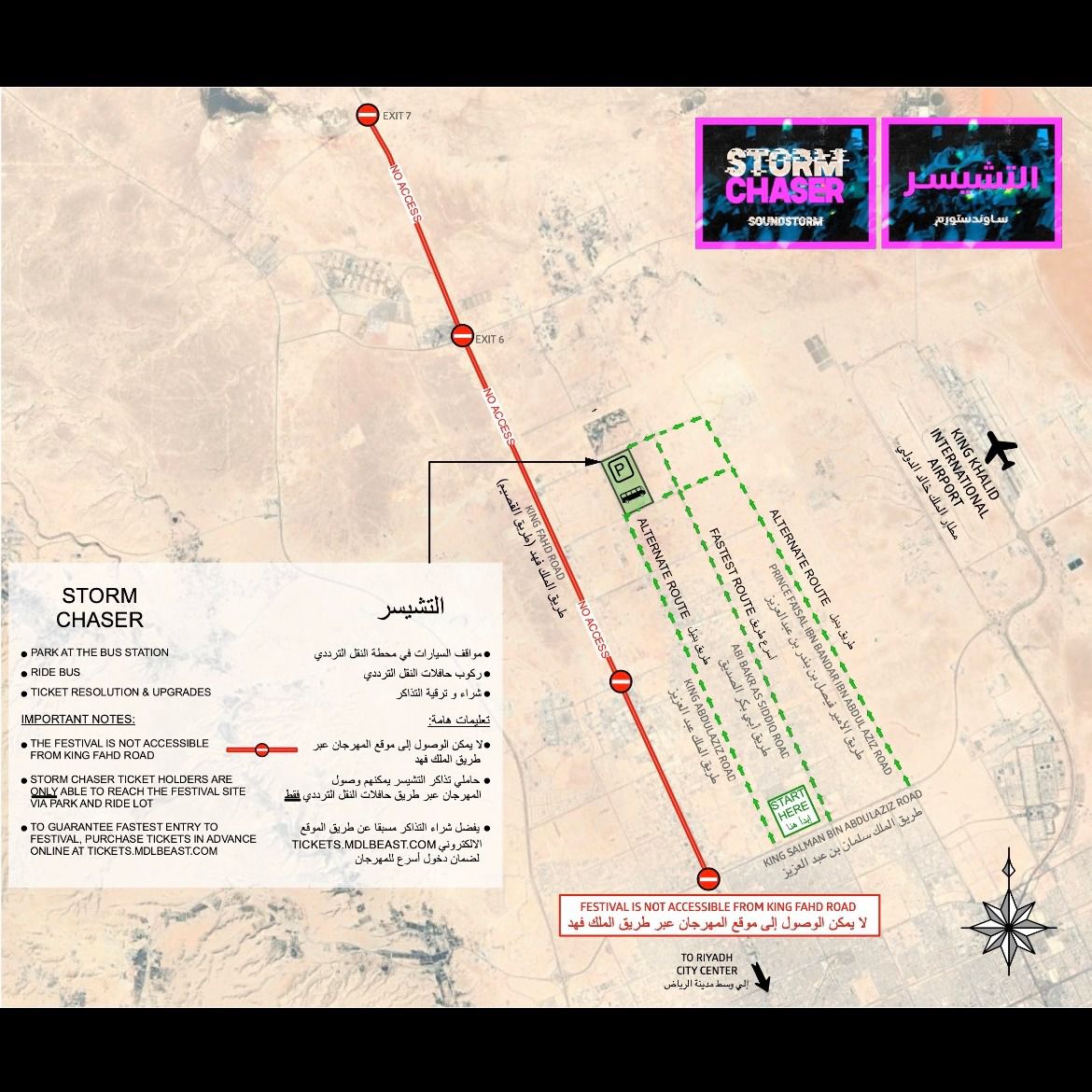 وسيكون الطريق الرئيسي إلى موقف سيارات حاملي تذاكر (VIB) والبليزر هو طريق الملك خالد (فقط) في حين يتعيّن على حاملي تذاكر التشيسر استخدام منطقة الحافلات للوصول إلى مهرجان ساوندستورم، ولا يمكنهم الوصول إلى المنطقة إلاّ عبر طريق أبوبكر الصديق أو طريق الأمير فيصل بن بندر بن عبدالعزيز (فقط).
