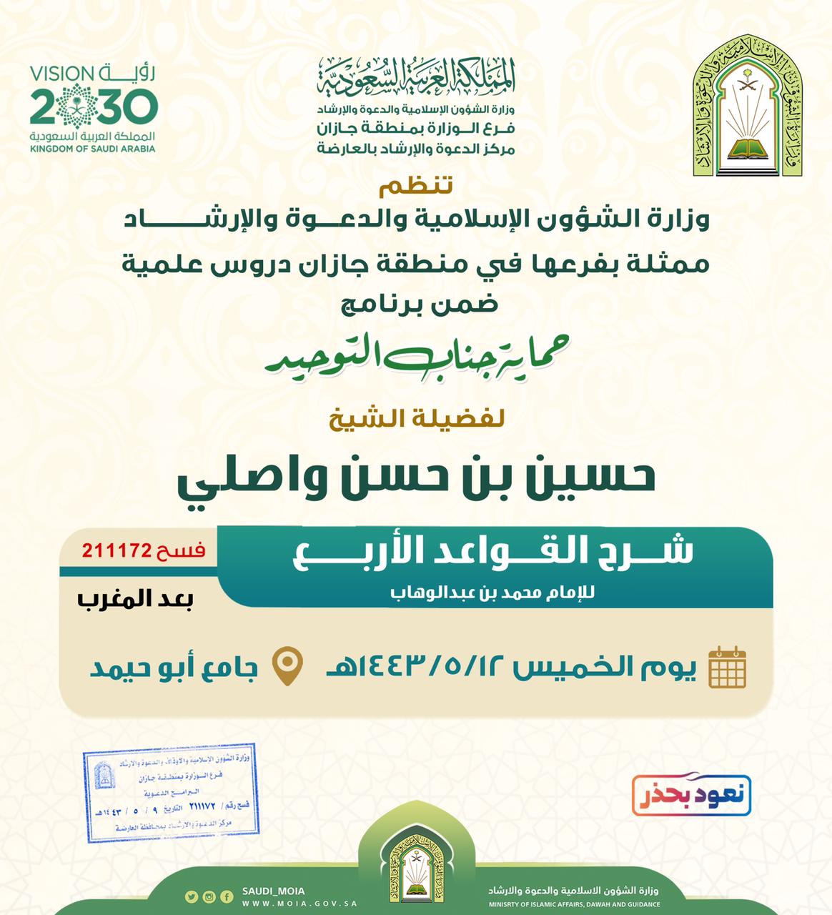 يواصل فرع وزارة الشؤون الإسلامية والدعوة والإرشاد بمنطقة جازان، ممثلاً في مركز الدعوة والإرشاد بالعارضة، تنفيذ برنامج (حماية جناب التوحيد)، حيث ينظم الفرع، يوم غد، درساً علمياً في شرح (القواعد الأربع للإمام محمد بن عبدالوهاب) يلقيه الشيخ حسين بن حسن واصلي، في جامع أبو حيمد بعد صلاة المغرب.