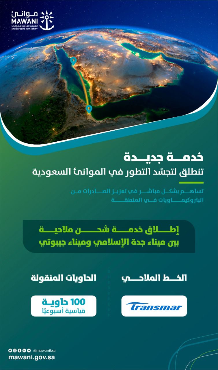 أعلنت الهيئة العامة للموانئ “موانئ” إضافة خدمة شحن ملاحية جديدة بين المملكة العربية السعودية ودولة جيبوتي عبر شركة “ترانسمار” الشركة الرائدة في مجال شحن الحاويات، في خطوة مهمة تهدف إلى تعزيز صادرات المملكة من البتروكيماويات في المنطقة، وزيادة عمليات المسافنة وشحن البضائع ونقلها ضمن الموانئ السعودية.