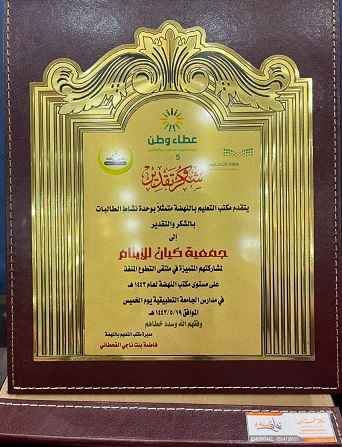 هذا وقدمت الأستاذة شيخة العتيبي المدير التنفيذي بجمعية كيان شكرها لمديرة مكتب تعليم النهضة الأستاذة فاطمة القحطاني على الدعوة للمشاركة بهذه المناسبة الطيبة والفاعلة وتمنت دوام التعاون فيما بينهم.