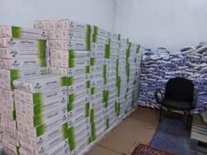 حيث اشتملت على توزيع (1161) سلة غذائية متكاملة وتوزيع ( 1700 ) بطانية ذات جودة عالية ، وكذلك اشتملت المبادرة على توزيع ( 1440 ) كيس دقيق، وتوزيع ( 785 ) كرتون تمر فاخر