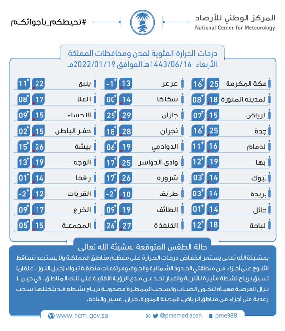 توقع المركز الوطني للأرصاد في تقريره عن حالة الطقس لهذا اليوم – بمشيئة الله تعالى – استمرار انخفاض درجات الحرارة على معظم مناطق المملكة ولا يستبعد تساقط الثلوج على أجزاء من منطقتي الحدود الشمالية والجوف ومرتفعات منطقة تبوك (جبل اللوز – علقان) تسبق برياح نشطة مثيرة للأتربة والغبار تحد من مدى الرؤية الافقية على تلك المناطق. في حين لا تزال الفرصة مهيأة لتكون الضباب والسحب الممطرة مصحوبة برياح نشطة قد يتخللها سحب رعدية على أجزاء من مناطق الرياض، المدينة المنورة، جازان، عسير والباحة.