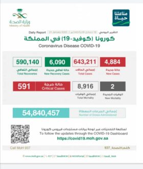 وبينت الإحصائية أن إجمالي عدد الإصابات في المملكة بلغ(643211) حالة وبلغ عدد حالات التعافي (590140) حالة .