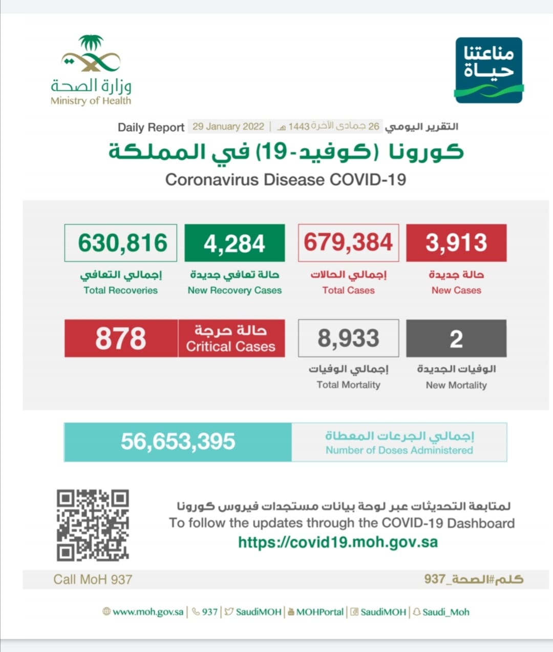 أعلنت الصحة إحصائية جديدة لمستجدات كورونا في المملكة خلال الـ 24 ساعة الماضية تضمنت تسجيل (3913) حالة مؤكدة وتعافي (4284) حالة فيما بلغ عدد الحالات الحرجة (878) حالة.
