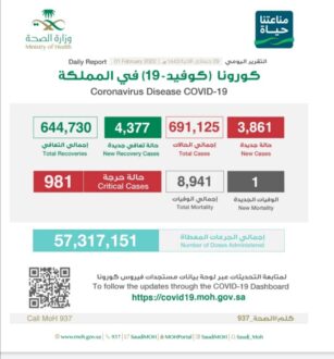 وبينت الإحصائية أن إجمالي عدد الإصابات في المملكة بلغ (691125) حالة وبلغ عدد حالات التعافي (644730) حالة، والحالات النشطة (37454).