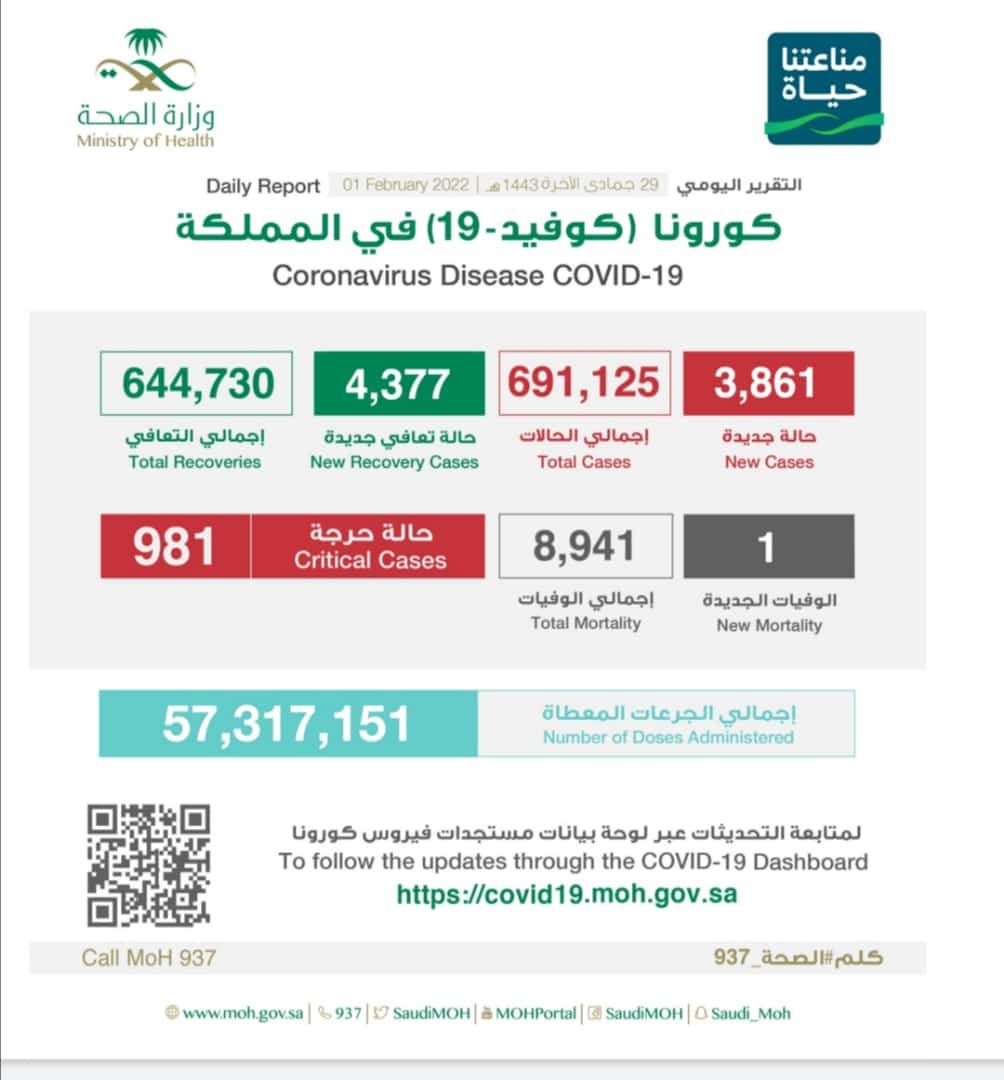 وفيما يخص الوفيات فقد تم تسجيل عدد (1) حالة واحدة حيث وصل إجمالي عدد الوفيات في المملكة (8941) حالة “يرحمهم الله جميعاً”.