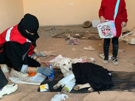 تفاجأت هدى الدوسري المتطوعة في الهلال الأحمر أثناء مشاركتها في الحملة بوجود كلب تعرض لحادث دهس فقامت على إنقاذه وعمل الإسعافات الأولية له وتجبيره من مبدأ إنساني وأن في كل كبد رطبة أجر كما حثنا ديننا الإسلامي الحنيف.
