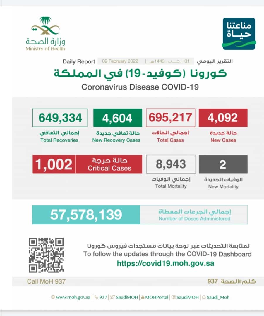 أعلنت الصحة إحصائية جديدة لمستجدات كورونا في المملكة خلال الـ 24 ساعة الماضية تضمنت تسجيل (4092) حالة مؤكدة وتعافي (4604) حالة فيما بلغ عدد الحالات الحرجة (1002) حالة،