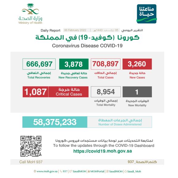 أعلنت الصحة إحصائية جديدة لمستجدات كورونا في المملكة خلال الـ 24 ساعة الماضية تضمنت تسجيل (3260) حالة مؤكدة وتعافي (3878) حالة فيما بلغ عدد الحالات الحرجة (1087) حالة،