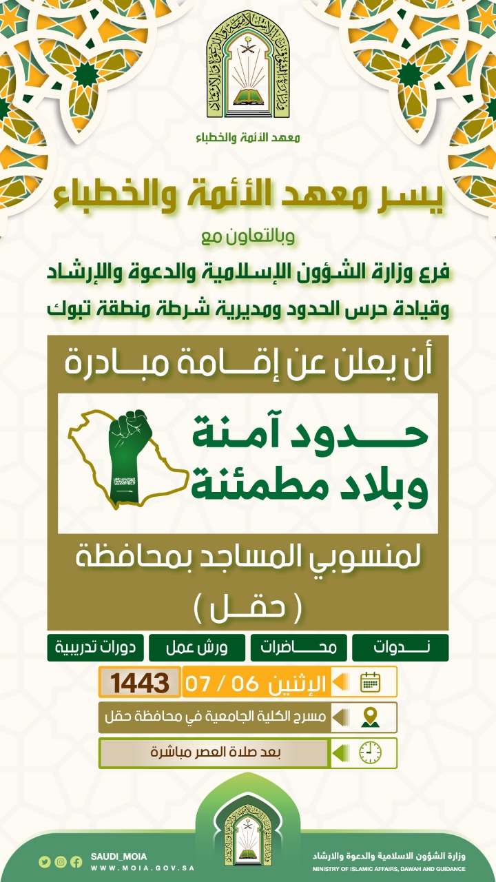 تنطلق غدا الاثنين مبادرة: (حدود آمنة ‏وبلاد مطمئنة)، التي ينظمها معهد الأئمة والخطباء، بالتعاون مع المديرية العامة لحرس الحدود ومديرية شرطة المنطقة