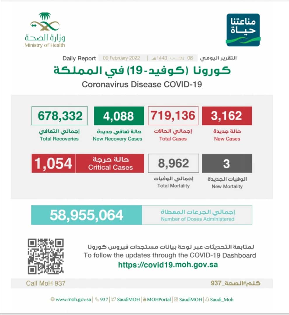 أعلنت الصحة إحصائية جديدة لمستجدات كورونا في المملكة خلال الـ 24 ساعة الماضية تضمنت تسجيل (3162) حالة مؤكدة وتعافي (4088) حالة فيما بلغ عدد الحالات الحرجة (1054) حالة،