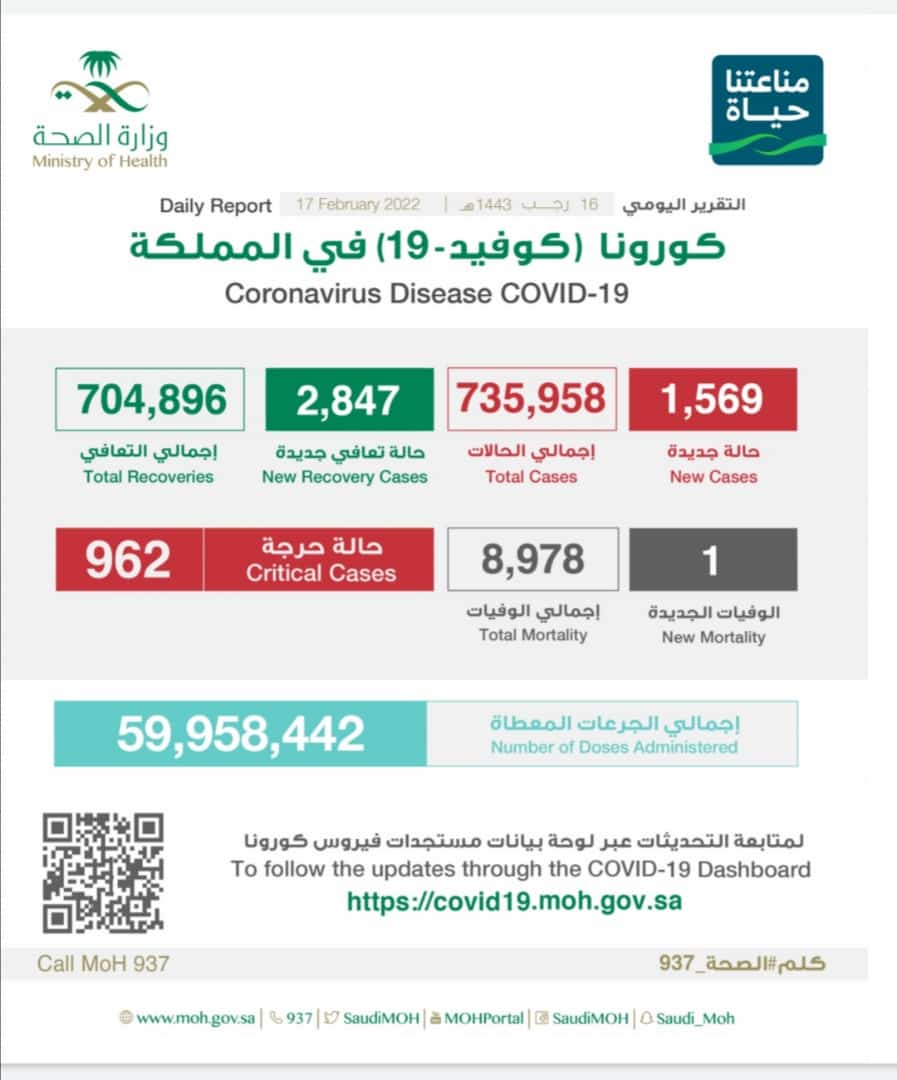 أعلنت الصحة إحصائية جديدة لمستجدات كورونا في المملكة خلال الـ 24 ساعة الماضية تضمنت تسجيل (1569) حالة مؤكدة وتعافي (2847) حالة فيما بلغ عدد الحالات الحرجة (962) حالة،