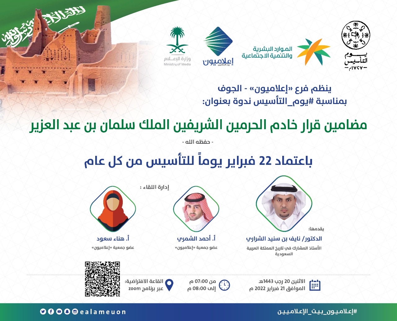 تستضيف جمعية إعلاميون فرع الجوف يوم الاثنين المقبل 2022/2/21 الندوة الافتراضية مع الباحث الدكتور نايف السنيد ليتحدث عن مضامين قرار خادم الحرمين الشريفين الملك سلمان بن عبدالعزيز ، باعتماد 22 فبراير يوماً للتأسيس من كل عام وللاحتفاء بذكرى تأسيس الدولة السعودية ، على أن يكون اسم المناسبة “يوم التأسيس” ،وهو اليوم الذي أسس فيه الإمام محمد بن سعود الدولة السعودية الأولى في العام 1139هـ ، الموافق 1727م وهو ما ساهم في إرساء الأمن والاستقرار في غالبية أرجاء الجزيرة العربية.