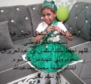 يوم التأسيس جاء ليجسد العمق التاريخي للمملكة العربية السعودية في أبلغ عبارة، وأوضح فكرة، وأجمل صورة. يوم نوشمه في القلوب ليكون تذكار ود ،ومحبة، وانتماء، وشغف ومسؤولية لهذا الوطن الغالي ، الذي أسس بنزيف العظماء وفروسيتهم وبطولتهم ، في هذه الذكرى الأولى والمباركة ليوم التأسيس كان لا بد من مشاركة عدد من مستفيدات جمعية كيان للأيتام ذوي الظروف الخاصة حيث التقيت بعدد من الأسر البديلة ليشاركوا فرحة الوطن بهذا اليوم العظيم .