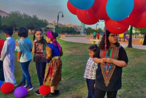 وقد استمتع الأطفال بالبرنامج الحافل بكل ما هو قديم وتراثي وشعبي . ومارسوا الألعاب الشعبية القديمة ودقوا على أبواب الجيران ليتعرفوا عليهم .واستمتعوا بالقصص والروايات القديمة ثم وزعت عليهم الهدايا القديمة والألعاب.