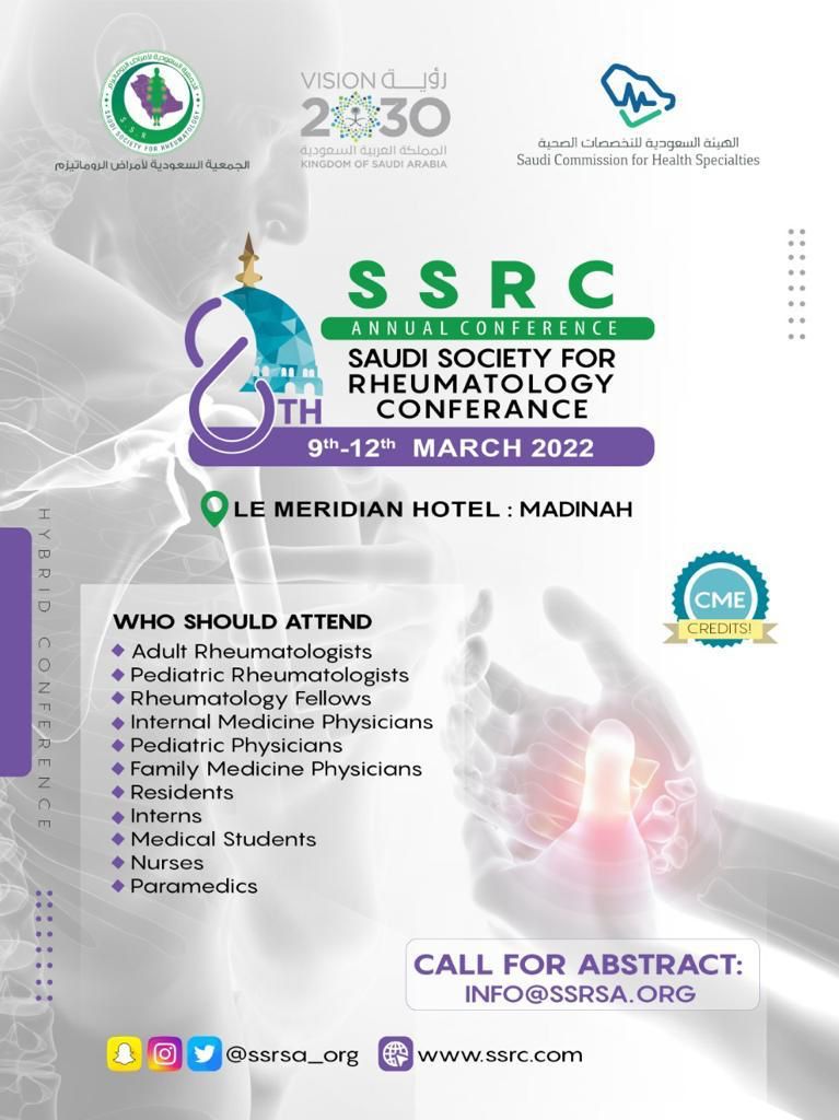 تنطلق اليوم فعاليات المؤتمر السنوي الثامن للجمعية السعودية لأمراض الروماتيزم، والذي سيعقد خلال الفترة من 9 إلى 12 مارس 2022م الموافق 6 إلى 9 شعبان 1443هـ في فندق ميريديان، المدينة المنورة، المملكة العربية السعودية.
