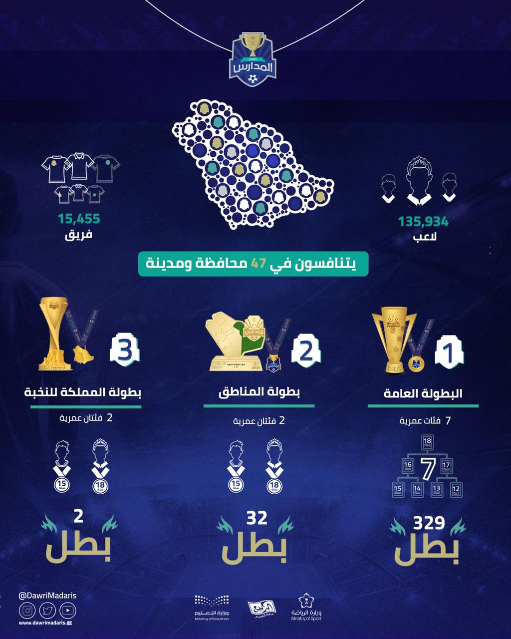 ويشارك في منافسات الدوري 3592 مدرسة من مدارس التعليم العام الابتدائي والمتوسط والثانوي، حيث بلغ عدد الطلاب المشاركين مع فرقهم المدرسية 135,934 طالباً يمثلون 15455 فريقاً.