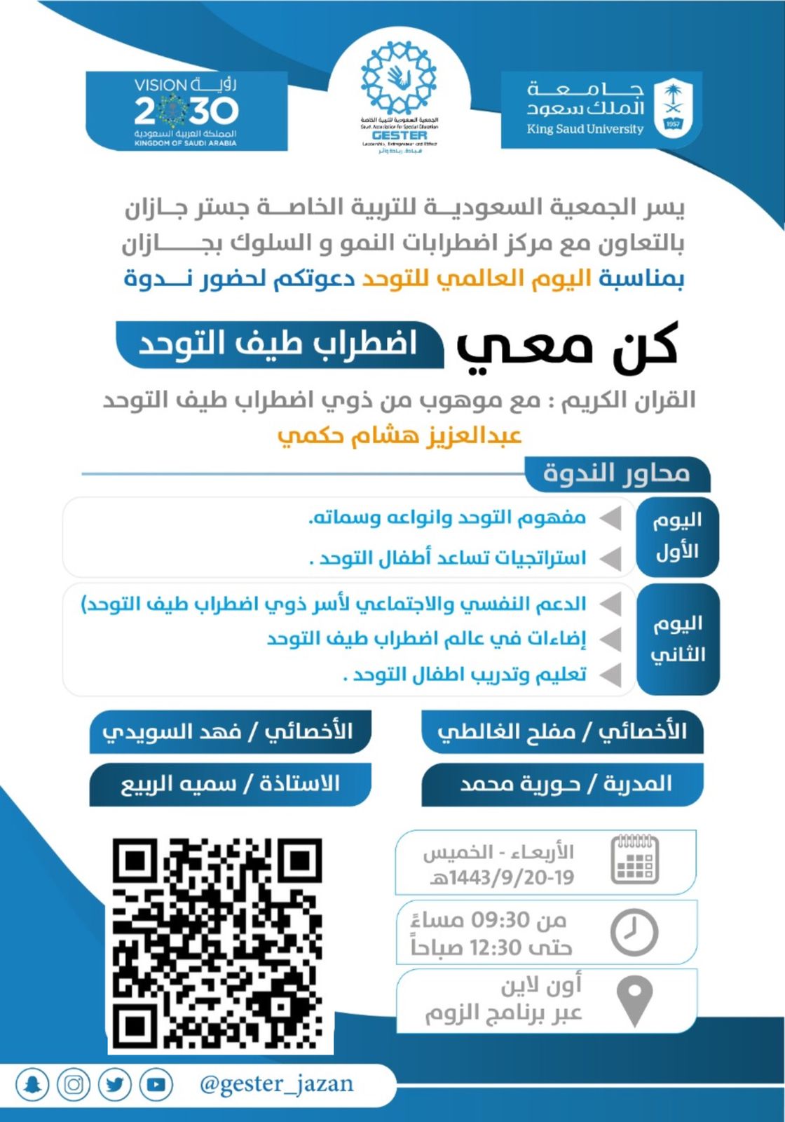 حيث تطرقوا في الندوة لعدة محاور مفهوم التوحد وأنواعه وسماته واستراتيجيات أطفال التوحد والدعم النفسي والاجتماعي لأسر ذوي اضطراب طيف التوحد وإضاءات في عالم طيف التوحد وتعليم وتدريب أطفال التوحد .