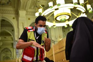 يشارك متطوعون، الدفاع المدني في خدمة ضيوف الرحمن في تقديم خدمات الإسعافات الأولية وإرشاد المعتمرين والزوار في المسجد الحرام والمسجد النبوي في شهر رمضان المبارك من خلال عدة نقاط تغطي أرجاء الحرمين الشريفين كافة .