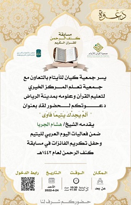 وقالت: فرحتنا كبيرة بتتويج أبنائنا وبناتنا الفائزين بحفظ سور من كتاب الله من خلال برنامج كنف الرحمن برعاية جمعية تعلم المركز الخيري لتعليم القرآن الكريم وعلومه، الذين نقدم لهم الشكر الجزيل على دعمهم وخاصة الأستاذ صالح الزهراني، مدير فرع الرياض، والأستاذ إبراهيم الراشد مدير إدارة التطوع الذي كان له دور كبير ومساهمة فعّالة، كما اشكر الأستاذة نورة البراهيم، مديرة القسم النسائي والمعلمات المميزات ومسؤولة العلاقات العامة الأستاذة عهود، على تعاونهم الكبير وحرصهم على إنجاز هذا البرنامج الذي سنسعى بإذن الله بأن تكون ثمرته هي بداية عملنا وطموحنا للمسابقة الكبرى بحفظ كتاب الله كاملاً، وستكون المشاركة متاحة لجميع أبنائنا وبناتنا الأيتام في جميع مناطق المملكة، كما أشكر جميع الداعمين من أهل الخير الذين ساهموا بتقديم الجوائز لهذه المسابقة، والشكر موصول للأمهات والمشاركات على حرصهم بحفظ كتاب الله.
